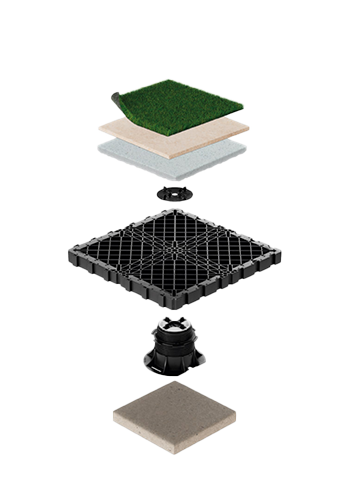 The system supports mixed surface installations, including porcelain paving and synthetic grass, making it ideal for green spaces, terraces, rooftops, and landscaped areas. Its modular grid features an integrated interlocking system for fast, precise installation without extra connectors.