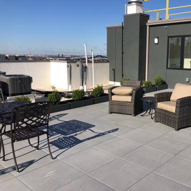 Create safe, long-lasting rooftop spaces with MRP Wind Uplift Tray. Ideal for rooftops, terraces, pathways, and social areas, each porcelain paver is permanently secured to a wind-uplift tray and fastened to pedestal supports for superior hold and stability.