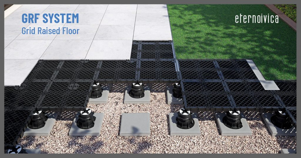 The system supports mixed surface installations, including porcelain paving and synthetic grass, making it ideal for green spaces, terraces, rooftops, and landscaped areas. Its modular grid features an integrated interlocking system for fast, precise installation without extra connectors.